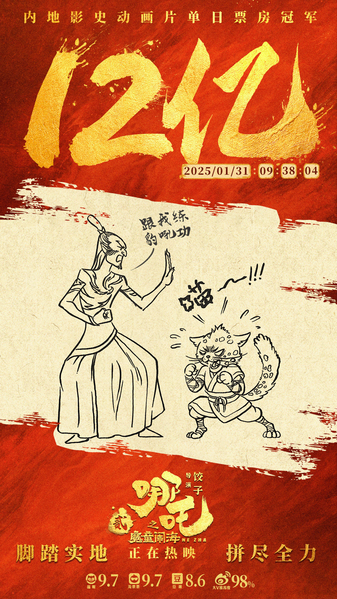 春节风物级电影《哪吒之魔童闹海》本日发布“申公豹平行世界全家福”版海报,豹家东说念主在平行世界过春节。申公豹一家东说念主接力改换运说念、却活在权势暗影之下的运说念让诸多不雅众共情啼哭。上映三日票房破11亿,全平台口碑断层起初春节档。不仅质料全标的特出哪吒第一部,更是为不雅众带来前所未见的震荡,场场爆满,以至出现“一票难买”的风物。畛域当今,影片票房已突破11亿,单日票房4.77亿,再度冲破由我方创造的内地影史动画电影最高首日、单日票房记录;全平台口碑握续发酵,多量不雅众盛赞“哪吒2让视觉奇不雅具象化了”、“千里浸在每一帧的震荡里”。电影由饺子导演携原班东说念主马经心打磨五年,悉力为不雅众带来独属于中国动画的思象力盛宴,现正世界热映中!