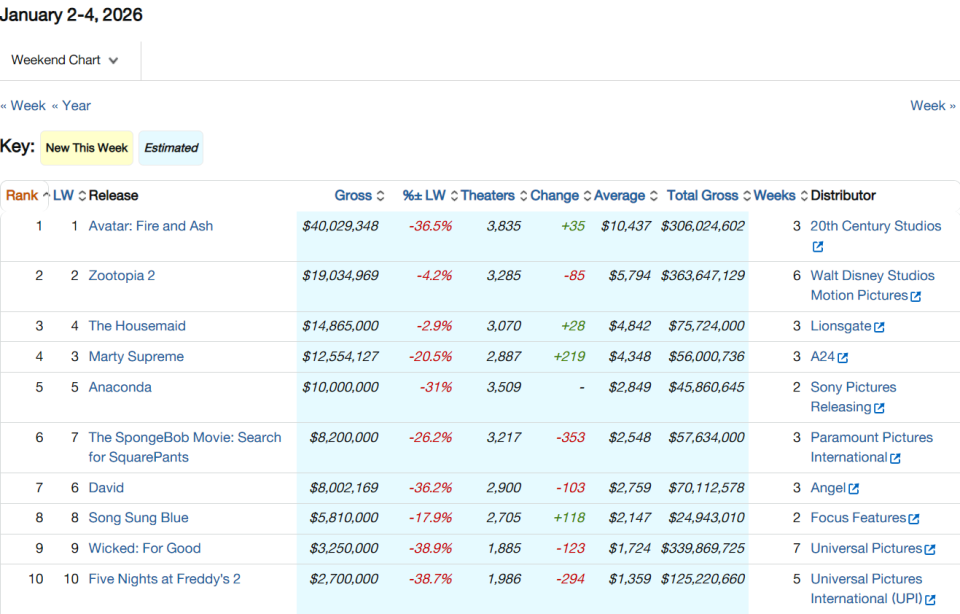 周六,好莱坞影迷们冒着冬日清冷涌入影院,共度新年第一个周末。据统计,2026年1月2日至4日历间,北好意思市集共有28部影片上映,周末总票房朝上1.3亿好意思元。