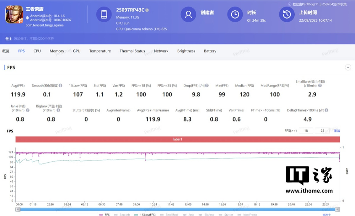 经由 25 分钟游戏后,PerfDog(性能狗)的帧率弧线非常稳重,最终游戏平均帧数为 119.9 帧,1% Low 帧也达到了 107 帧。