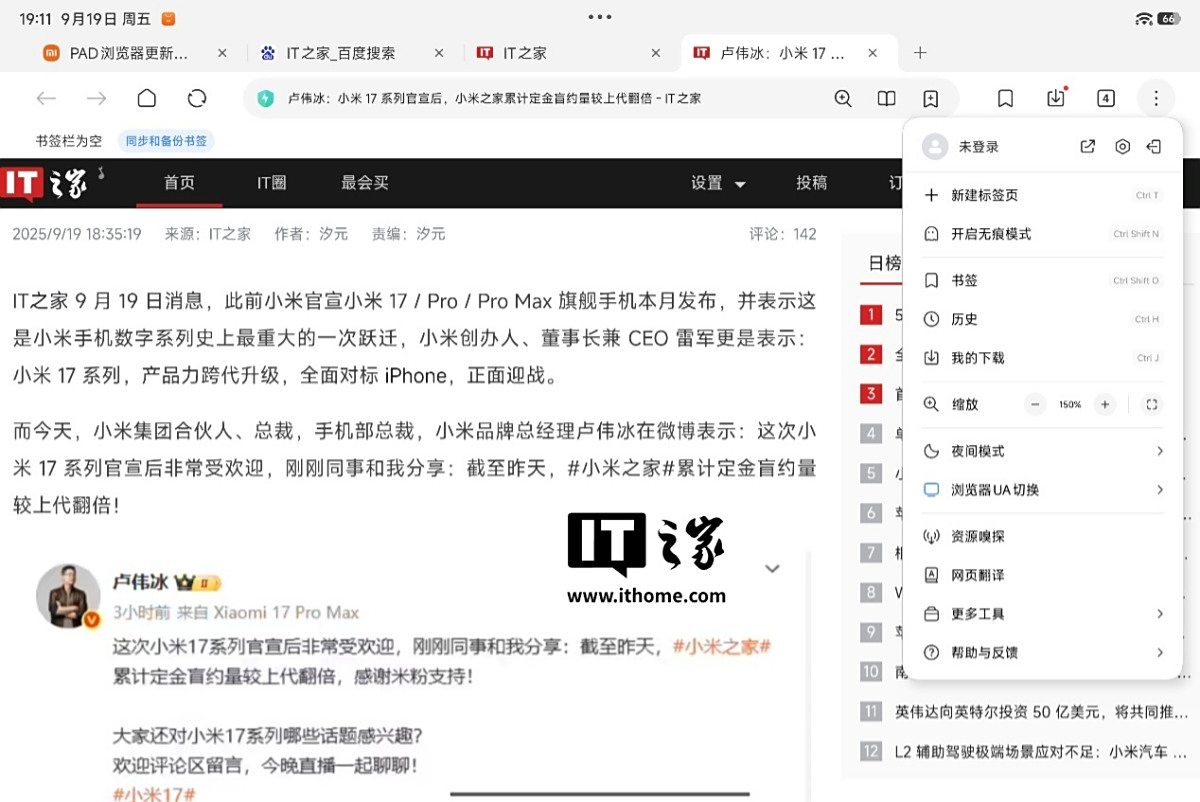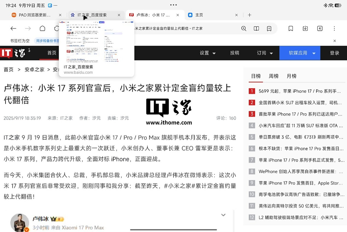掀开浏览器后,默许就所以 PC 浏览器的 UI 和页面布局进行自大,支抓标签页、鼠标悬停手势,键盘快捷组合键、网页比例缩放等等,谐和小米磁吸键盘保护套配件和蓝牙鼠标,使用起来无需任何适合门槛。