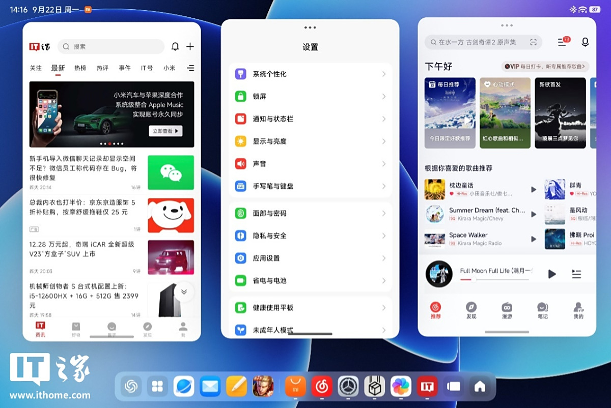 用户也可以在竖屏使用平板时,开启高下两个面积调换的哄骗分屏,比较横向 5:5 分屏不仅好像完竣展示两个哄骗的实质,还可以鄙人分屏哄骗中专注于交互操作,如记札记、绘制、游戏等,上分屏哄骗则专注于得到信息,无需世俗切换操作,如展示良友、小红书札记、视频游戏攻略等实质,一心也能二用。