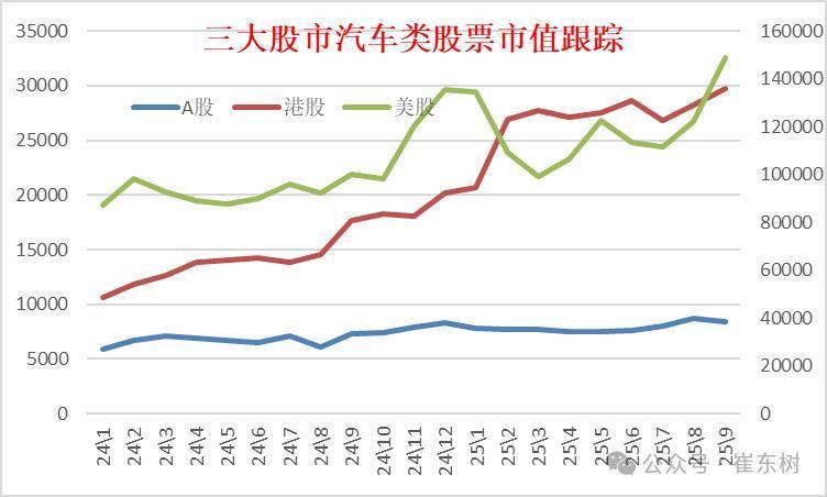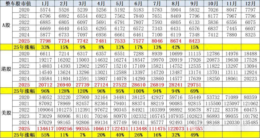 从A股和港股、好意思股的汽车整车企业股市值走势来看,本年港股的市值走势发达相对较强,相干于好意思股的市值走势,港股市值走势的上市趋势是比较昭着的,从2024年1月份的港股的整车企业市值贪图1万亿元限度,到2025年的9月份达到2.97万亿元,也便是从1万亿元到3万亿元的限度,港股的汽车股的限度收尾了市值大幅增长的特征,其中有新股上市的要素,也有股票市值的升值要素。