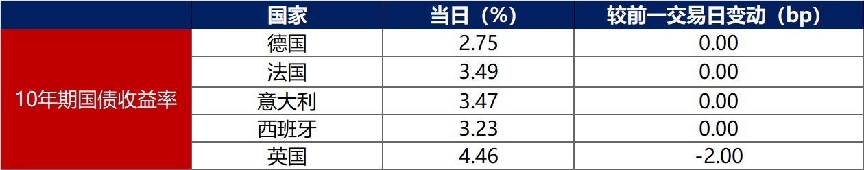 12月2日,除英国10年期国债收益率下行2bp外,其余主要欧洲经济体10年期国债收益率均保捏不变。其中,德国10年期国债收益率保捏在2.75%不变。