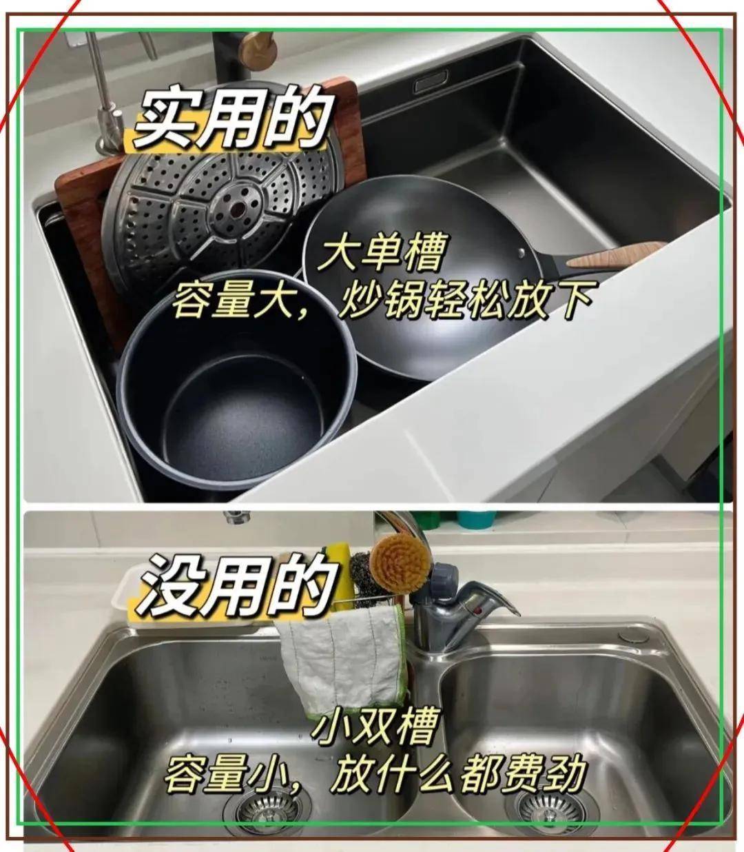 ❌ 鸡肋:小双槽啥皆放不下!洗锅只可放一半,洗菜还得挪来挪去,用一次气一次!