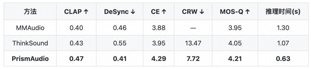 咱们作念了严格的测试,在传统的 VGGSound 测试集上,PrismAudio 全面特出了现存最佳时事: