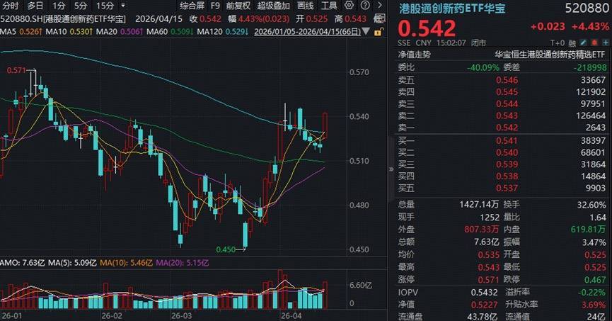 港股通创新药攻势尤为迅猛, 520880午后一度涨至4.62%,全天成交7.63亿元,较昨日激增梗概!赤脚大阳线强势收场五连阴,单日突破5日、10日及半年线等3根均线,彰显多头力量。