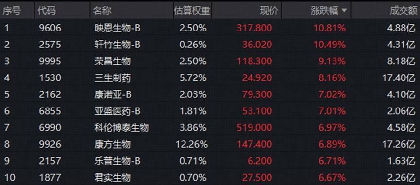 50只成份股中43股收涨,轩竹生物-B新药获批III期临床参议,盘月朔度狂飙逾22%,收涨10.49%。映恩生物-B拟冲刺科创板IPO,股价暴涨10.81%。权重龙头集体大涨,三生制药涨8.16%,康方生物涨6.89%。