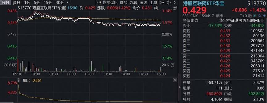 港股本日走势较强,科网龙头涨势不俗,阿里巴巴-W盘中大涨5%,收涨逾3%;腾讯控股盘中涨超3%,收涨逾1%;此外,快手-W、哔哩哔哩-W、好意思团-W、小米集团-W集体收涨。港股AI核心器具——港股互联网ETF华宝(513770)场内价钱一度涨超3%,收涨1.42%。